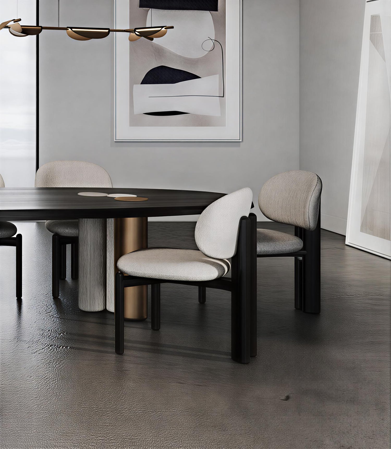 De combinatie van een zacht gevormde bouclé-zitting en een verfijnd houten frame creëert harmonie rond elke tafel, een rustpunt in tijdloos design.