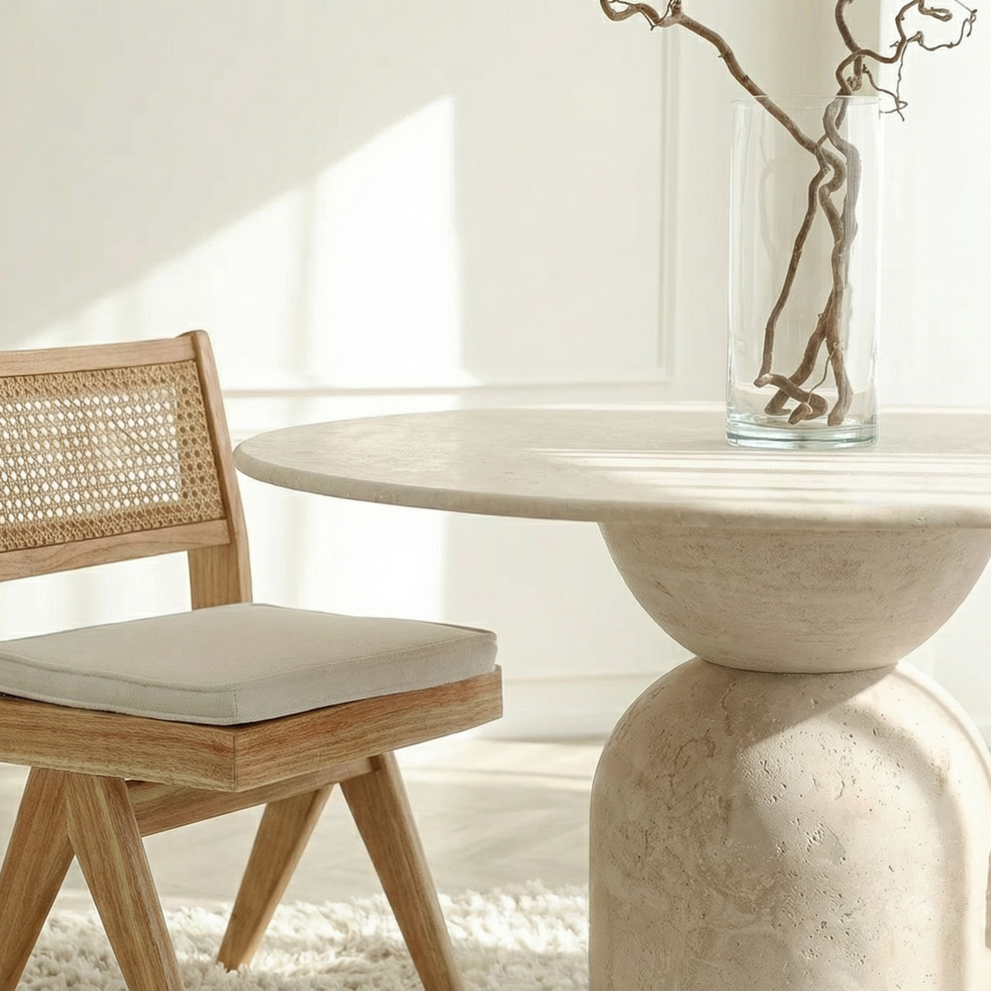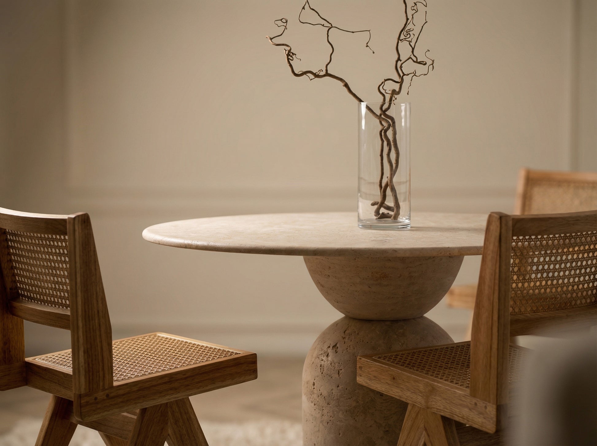 Het ronde travertin blad rust op een zorgvuldig gevormde voet die balans en rust uitstraalt. De natuurlijke kleurnuances, zachte aders en subtiele poriën geven het oppervlak een levendig, maar ingetogen karakter. Het ontwerp voelt zwaar en licht tegelijk, een zeldzame spanning die het interieur verdieping geeft zonder te domineren.