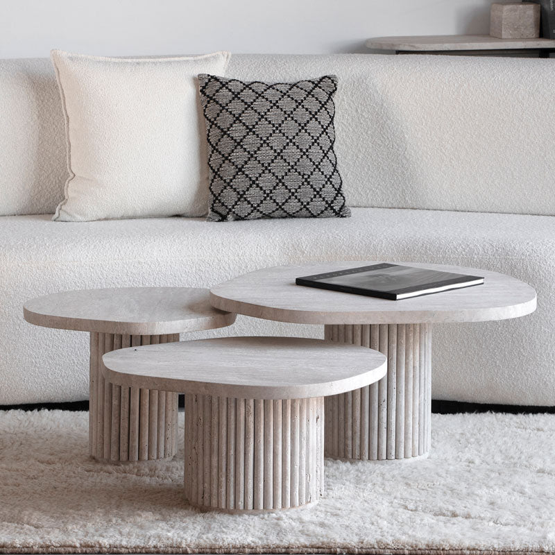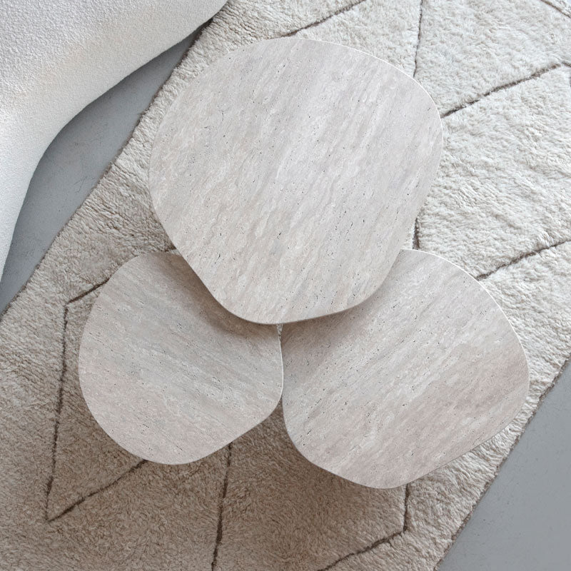 De NOUMA salontafelset bestaat uit drie organisch gevormde tafels, met zorg vervaardigd uit massief travertin. De zachte lijnen en subtiele beige nuances brengen natuurlijke balans in elke ruimte. Dankzij de verschillende hoogtes kun je de tafels elegant over elkaar laten vallen of los plaatsen — een spel van licht, textuur en schaduw dat blijft intrigeren.